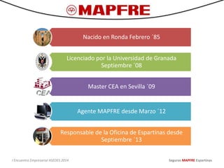 El documento presenta a Álvaro Castillo, agente de seguros de MAPFRE en Espartinas desde 2013. MAPFRE es una compañía de seguros multinacional española líder en seguros de automóvil, hogar y vida. El documento ofrece una variedad de seguros para personas, vehículos, empresas y patrimonio e invita a los lectores a contactar con Álvaro Castillo para obtener una oferta integral de MAPFRE.