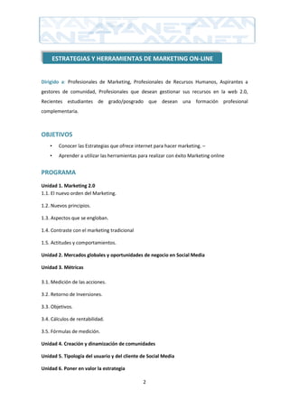 Este documento presenta un resumen de varios cursos de marketing online y redes sociales. Los cursos cubren temas como estrategias de marketing 2.0, métricas de marketing, creación de comunidades en línea, gestión de marca y reputación, y cómo realizar contactos efectivos a través de redes. Los programas de los cursos incluyen unidades sobre herramientas de marketing en línea, mercados globales, medición de resultados, tipos de usuarios de redes sociales y casos prácticos de marketing en redes.