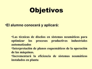 Este documento presenta diferentes técnicas de diseño para sistemas neumáticos industriales, incluyendo principios de control, documentación de proyectos mediante esquemas, métodos secuenciales, cascada y paso a paso. Explica conceptos como mandos secuenciales, contadores neumáticos y aplica estas técnicas para optimizar procesos productivos automatizados.