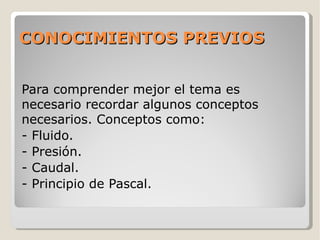 Este documento describe los conceptos básicos de los circuitos hidráulicos y neumáticos. Explica los fluidos, la presión, el caudal y el principio de Pascal. Luego describe los componentes clave de un circuito neumático como el compresor de aire, las tuberías, los actuadores como cilindros y motores, y los elementos de control como las válvulas distribuidoras. Finalmente, resume algunos usos comunes de la neumática en la industria.