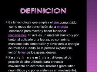 La tecnología neumática emplea el aire comprimido para transmitir energía y mover mecanismos. Los sistemas neumáticos están compuestos de elementos de control como válvulas, que distribuyen y regulan el flujo de aire, y actuadores como cilindros que convierten la presión del aire en movimiento. Los circuitos neumáticos incluyen generadores de aire comprimido, tuberías, y elementos de control para producir, transmitir y transformar fuerzas neumáticas.