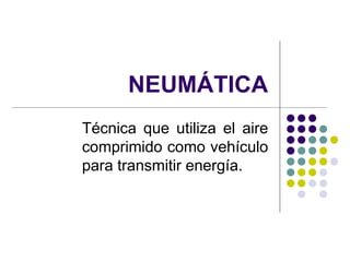 Este documento trata sobre los conceptos básicos de la neumática, incluyendo sus elementos, ventajas e inconvenientes y aplicaciones. Explica que la neumática utiliza el aire comprimido para transmitir energía de forma sencilla y rápida. También describe los componentes clave de un sistema neumático como compresores, conductos, válvulas y actuadores neumáticos.