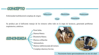La neumoenteritis es una enfermedad multifactorial en terneros, causada por diversos patógenos y factores de manejo deficientes, que afecta principalmente la salud respiratoria y digestiva. Su diagnóstico se basa en signos clínicos y análisis de muestras fecales, mientras que el tratamiento incluye rehidratación, antibióticos y terapia de apoyo. Se recomienda la prevención a través de un manejo adecuado, asegurando la ingestión de calostro y la vacunación de los terneros.