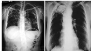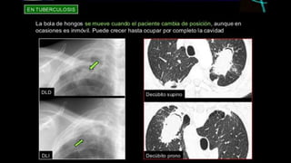 La aspergilosis pulmonar es una infección micótica causada por el hongo Aspergillus que crece en las cavidades pulmonares. El hongo Aspergillus es común y crece en vegetación descompuesta, y la infección afecta a personas con sistemas inmunes debilitados. Las formas clínicas incluyen una forma alérgica, aspergilomas que aparecen como masas en radiografías, y una forma diseminada que amenaza la vida. El diagnóstico se realiza mediante exámenes radiológicos,