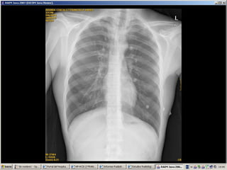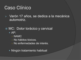 Este documento presenta el caso de un varón de 17 años que trabaja en mecánica automotriz y que experimentó dolor torácico y cervical después de limpiar un motor con gasolina. La exploración física mostró enfisema subcutáneo en el cuello y área supraclavicular derecha, con roce pericárdico. Los exámenes mostraron leucocitosis y niveles elevados de CPK. El diagnóstico fue neumomediastino espontáneo.