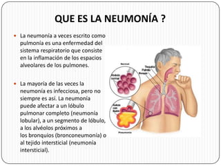 La neumonía es una inflamación de los pulmones que generalmente es causada por infecciones bacterianas o virales. Puede afectar diferentes áreas de los pulmones. Las personas de edad avanzada, menores de edad, e inmunocomprometidos son más propensos a contraerla. Los síntomas incluyen fiebre, tos con flema, dificultad para respirar y dolor torácico. El diagnóstico se realiza mediante rayos X y análisis de sangre y esputo. El tratamiento consiste principalmente en antib