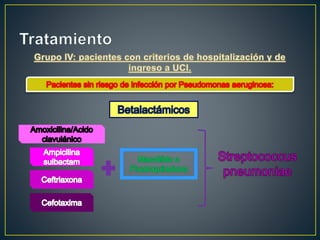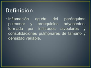 La neumonía es una inflamación aguda del parénquima pulmonar causada principalmente por bacterias como Streptococcus pneumoniae y virus. Afecta a millones de personas anualmente y es una de las principales causas de muerte a nivel mundial. Su diagnóstico se realiza mediante examen físico, radiografía de tórax y pruebas para identificar el agente causal. El tratamiento depende de la gravedad de los síntomas y factores de riesgo del paciente.