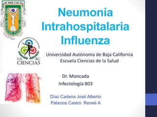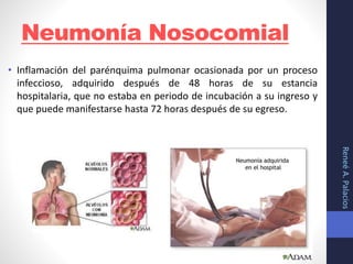 Este documento discute la neumonía asociada a la ventilación mecánica (NAVM), incluyendo sus factores de riesgo, manifestaciones clínicas, pruebas de diagnóstico y tratamiento. Explica que la NAVM es una complicación común en pacientes en unidades de cuidados intensivos que desarrollan infiltrados pulmonares nuevos después de 48-72 horas de intubación. Los factores de riesgo incluyen la duración prolongada de la ventilación, la presencia de dispositivos invasivos y el uso previo de