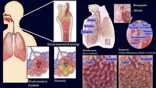 Este documento proporciona información sobre neumonía, incluyendo su definición, clasificaciones, agentes etiológicos, presentación clínica, diagnóstico, tratamiento y prevención. La neumonía se define como un proceso infeccioso del parénquima pulmonar causado por la presencia de microorganismos. Existe neumonía adquirida en la comunidad y nosocomial. Los síntomas incluyen tos, disnea y fiebre. El diagnóstico incluye radiografía de tórax y estrat