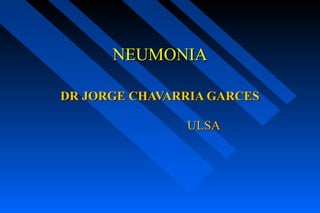 La neumonía se define como un proceso inflamatorio y consolidativo del tejido pulmonar debido a agentes infecciosos. Existen dos tipos principales: la neumonía adquirida en la comunidad (NAC), que se desarrolla fuera del hospital, y la neumonía nosocomial adquirida en el hospital (NAH). La etiología, presentación clínica, tratamiento y pronóstico varían según el tipo de neumonía.