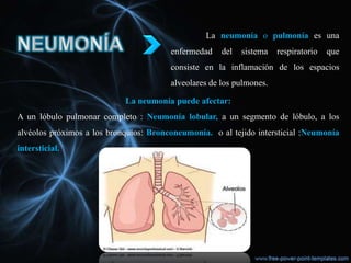 La neumonía es una inflamación de los pulmones que puede ser causada por virus, bacterias u hongos. Los síntomas incluyen fiebre, tos con flema, dificultad para respirar y dolor al respirar. El diagnóstico se realiza mediante radiografía de tórax. El tratamiento para las neumonías bacterianas son antibióticos, y en algunos casos es necesario el ingreso hospitalario. La vacunación antigripal y antineumocócica puede prevenir algunos tipos de neumonía.