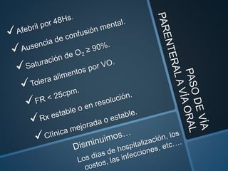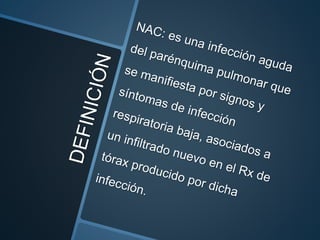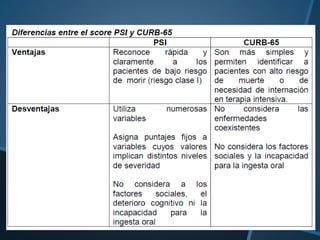 Este documento presenta las guías de la Sociedad Argentina de Medicina sobre el diagnóstico y tratamiento de la neumonía adquirida en la comunidad. Describe los síntomas clínicos, exámenes complementarios recomendados y opciones de tratamiento dependiendo de la gravedad del caso, ya sea en un entorno ambulatorio, hospitalario o de terapia intensiva. Además, provee detalles sobre la clasificación de neumonías típicas vs atípicas y herramientas como el índice PSI y CURB-65 para