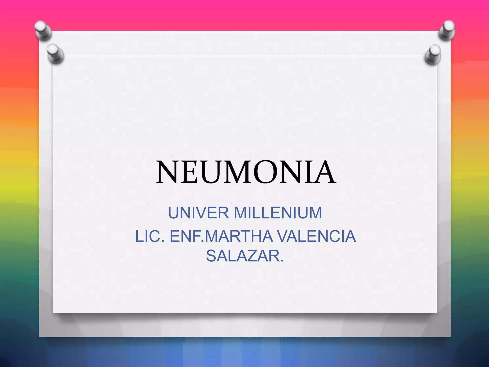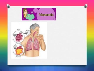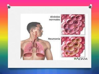 La neumonía es una inflamación del parénquima pulmonar causada por agentes infecciosos que pueden causar consolidación alveolar. Existen dos tipos principales: neumonía extrahospitalaria adquirida en la comunidad y neumonía intrahospitalaria asociada a la hospitalización. Los síntomas incluyen fiebre, tos, dolor torácico y dificultad respiratoria. El diagnóstico se realiza mediante radiografía de tórax, cultivos y análisis de laboratorio. El tratamiento depende de