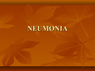 La neumonía es una infección del pulmón causada por un agente infeccioso como virus, bacterias, hongos o parásitos. Los síntomas incluyen fiebre, tos, dificultad para respirar y dolor torácico. La neumonía se clasifica según su causa, gravedad y lugar de adquisición (comunidad u hospital). El tratamiento depende del agente causal y puede incluir antibióticos, antivirales u otros medicamentos.