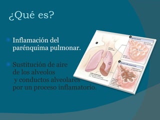 La neumonía es una inflamación del parénquima pulmonar causada principalmente por virus o bacterias. Es una de las principales causas de mortalidad infantil a nivel mundial. Los factores de riesgo incluyen la edad, estado inmunológico y lugar de adquisición. Los síntomas pueden incluir fiebre, tos productiva y consolidación pulmonar visible en radiografías. El tratamiento depende del agente causal y puede incluir antibióticos, oxígeno y soporte de órganos. Las complicaciones graves incluyen insufici