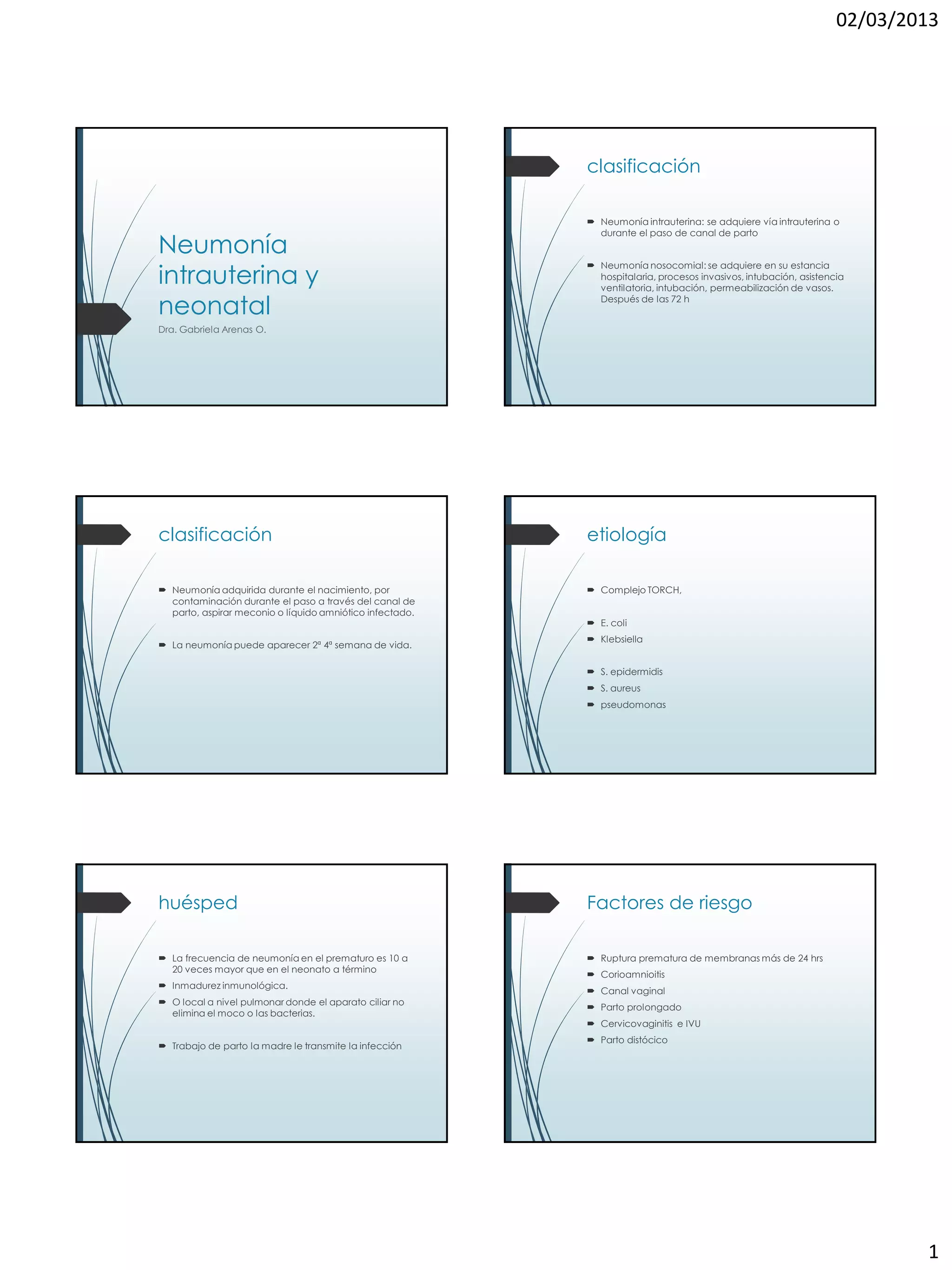 La neumonía intrauterina y neonatal se clasifica según cuándo se adquiere, ya sea durante el paso por el canal de parto o después de las 72 horas de vida. Los principales agentes etiológicos son bacterias como E. coli, Klebsiella, y S. aureus. Los factores de riesgo incluyen ruptura prematura de membranas por más de 24 horas, corioamnioitis y parto prolongado. El diagnóstico se basa en manifestaciones clínicas y hallazgos radiológicos como infiltrados alveolares persistentes.