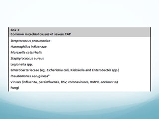 La neumonía adquirida en la comunidad tiene una alta mortalidad de hasta el 56%. El diagnóstico se realiza clínica y radiológicamente y mediante pruebas para detectar el microorganismo causante. El tratamiento empírico debe iniciarse dentro de las 4 horas para disminuir la mortalidad y cambiarse a vía oral cuando el paciente esté estable.