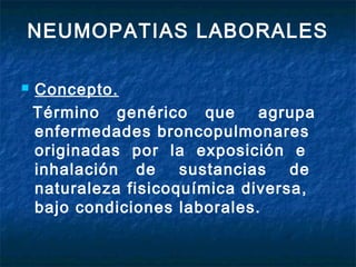 Este documento describe las neumopatías laborales, enfermedades pulmonares causadas por la exposición a sustancias en el lugar de trabajo. Explica que pueden ser obstructivas como la bronquitis crónica o restrictivas como la silicosis. También cubre las industrias responsables, sustancias involucradas, mecanismos de daño, diagnóstico, tratamiento y más.