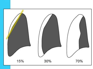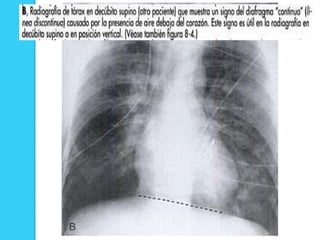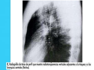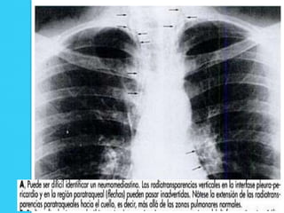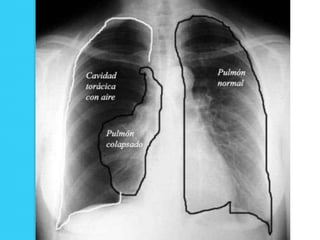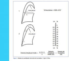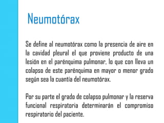 Este documento describe los diferentes tipos de neumotórax, incluyendo neumotórax espontáneo, traumático e iatrogénico. Explica cómo se clasifican y cuantifican los neumotórax, así como los hallazgos radiográficos característicos como la línea pleural y la ausencia de vasos pulmonares distales. También describe signos de neumotórax a tensión como el colapso pulmonar completo y la depresión del diafragma.