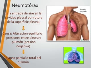 Un neumotórax ocurre cuando el aire ingresa al espacio pleural entre los pulmones y la pared torácica, causando el colapso parcial o total de un pulmón. Puede ser espontáneo, traumático o secundario a enfermedades pulmonares. Los síntomas incluyen dolor torácico agudo y dificultad respiratoria. El tratamiento varía desde la observación para neumotórax pequeños hasta la inserción de tubos de drenaje pleural y cirugía para casos graves.