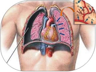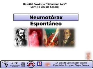 El documento describe el diagnóstico y tratamiento del neumotórax espontáneo. Se revisa la historia y clasificación del neumotórax, así como su epidemiología, fisiopatología, diagnóstico, complicaciones y diferentes modalidades de tratamiento como el reposo, aspiración con aguja, drenaje pleural, pleurodesis y cirugía. El documento fue escrito por un especialista en cirugía torácica y proporciona información sobre el manejo actual del neumotórax espontáneo.