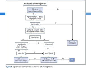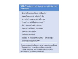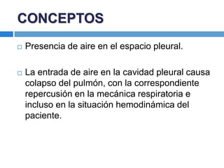 Este documento describe el neumotórax, comenzando con su definición y clasificación en espontáneo, iatrogénico y traumático. Explica los conceptos básicos, signos y síntomas, diagnóstico, tratamiento con drenaje y cirugía, y prevención de recurrencias. Resalta que el neumotórax es la presencia de aire en el espacio pleural que causa colapso pulmonar y afecta la mecánica respiratoria.