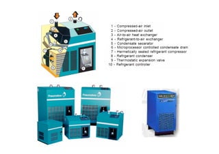 Las instalaciones neumáticas utilizan aire comprimido como fuente de energía. Los compresores comprimen el aire atmosférico a una presión más alta, y pueden ser de émbolo o rotativos. El aire comprimido requiere acondicionamiento para eliminar humedad, aceite y partículas antes de su uso, utilizando secadores, filtros y lubricadores.