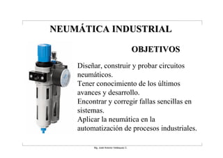 Este documento presenta información sobre neumática industrial, incluyendo objetivos, propiedades del aire comprimido, actuadores neumáticos como cilindros y sus partes, tipos de cilindros, guias, válvulas neumáticas, y ejemplos de aplicaciones. Explica conceptos clave de la neumática como la producción de trabajo mediante el aire comprimido y el funcionamiento básico de componentes como cilindros y válvulas 3/2.