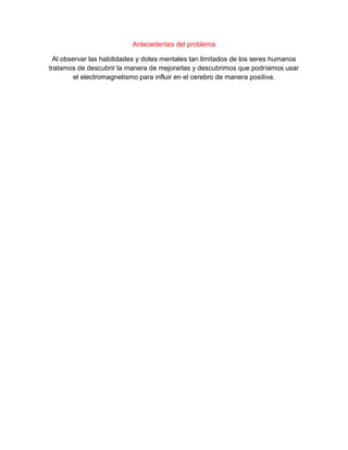 El documento propone desarrollar un casco con sensores electromagnéticos que envíen ondas al cerebro para mejorar las capacidades mentales y artísticas de las personas al desactivar temporalmente la actividad en el hemisferio izquierdo. El objetivo es elevar las capacidades mentales a través de este dispositivo y revolucionar el mundo.