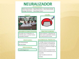 Este documento presenta un proyecto para crear un dispositivo llamado Neuralizathor que pueda elevar las capacidades mentales humanas utilizando materiales caseros. El objetivo es desactivar temporalmente la actividad en el hemisferio izquierdo del cerebro para desarrollar habilidades ocultas. El equipo planea construir un prototipo de casco con sensores electromagnéticos y luego probarlo en voluntarios para ver si mejora sus capacidades mentales.