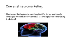 El neuromarketing consiste en aplicar técnicas de neurociencia como EEG, fMRI y MEG a la investigación de marketing para comprender mejor cómo los estímulos afectan el comportamiento de las personas. Esto permite a las empresas identificar los estímulos que influyen en las decisiones de compra y alinear sus estrategias de marketing a las necesidades reales de los consumidores.