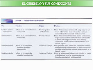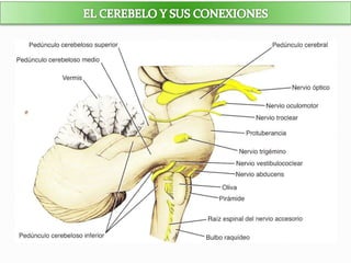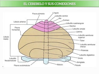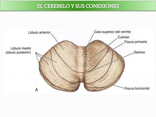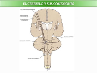 El documento describe la anatomía macroscópica y microscópica del cerebelo, incluyendo su estructura, áreas funcionales de la corteza cerebelosa, núcleos intracerebelosos, sustancia blanca, mecanismos corticales y nucleares, fibras aferentes y eferentes, y funciones. El cerebelo se compone de sustancia gris cortical y sustancia blanca interna, y está involucrado en el control motor fino y el equilibrio a través de circuitos que incluyen la corteza cerebral, tronco encefá