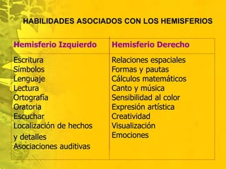 El documento describe los avances en el campo de la neurociencia cognitiva y cómo éstos han permitido una mejor comprensión de los procesos de aprendizaje en el cerebro humano. Explica que existen diferentes estilos de aprendizaje (visual, auditivo y cinestésico) y estrategias específicas para cada uno que pueden optimizar el aprendizaje. También aborda conceptos como las inteligencias múltiples y la importancia de conocer los estilos de aprendizaje de cada estudiante para individualizar la instrucción.