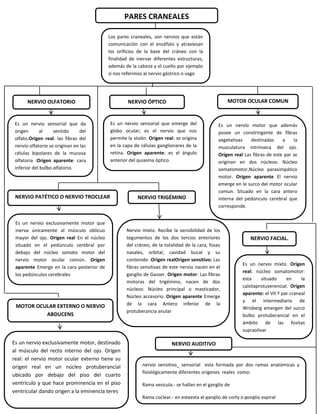 Este documento describe las actividades de la unidad 4 sobre la anatomía del sistema nervioso periférico y los pares craneales de una estudiante de ciencias de la educación. Incluye mapas conceptuales y resúmenes de cada uno de los 12 pares craneales, con detalles sobre su origen, estructura y funciones.
