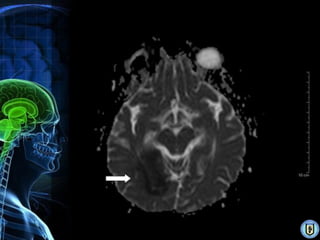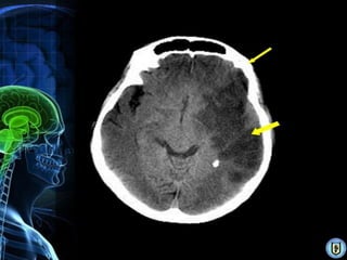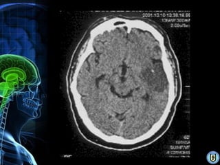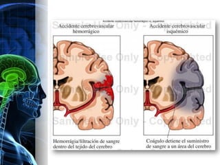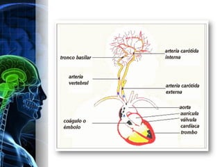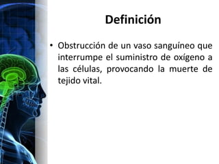 Este documento describe el accidente cerebrovascular isquémico, que ocurre cuando se obstruye un vaso sanguíneo en el cerebro, interrumpiendo el flujo de oxígeno. Los principales factores de riesgo incluyen la hipertensión, la edad y el tabaquismo. Los síntomas varían según la ubicación de la obstrucción, pero pueden incluir debilidad, problemas de habla o visión. El diagnóstico incluye imágenes médicas como la RMN o TAC, y el tratamiento se centra en fá