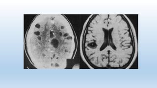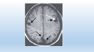 La neurocisticercosis (NCC) es causada por larvas del céstodo Taenia solium en el sistema nervioso central. Se presenta como quistes intraparenquimatosos que causan convulsiones, o quistes extraparenquimatosos que causan hipertensión endocraneana. El diagnóstico se realiza mediante imágenes como tomografía o resonancia magnética y confirmado con pruebas serológicas e inmunológicas. El tratamiento incluye medidas sintomáticas y antiparasitarios como albendazol o praziqu
