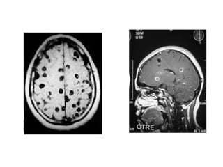 Este documento describe la neurocisticercosis, una infección del sistema nervioso causada por la larva de Taenia solium. Explica el ciclo de vida del parásito, las formas de adquisición de la infección, las manifestaciones clínicas, el diagnóstico mediante pruebas de neuroimagen e inmunológicas, y el tratamiento con medicamentos cisticidas y cirugía.