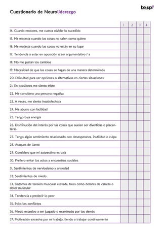 El documento presenta un cuestionario sobre neuroliderazgo que evalúa hábitos cotidianos para identificar áreas del cerebro que pueden estar bloqueadas o funcionando a pleno rendimiento. El cuestionario contiene 70 preguntas sobre dificultades de atención, impulsividad, estados de ánimo, memoria y sensibilidad, que el usuario debe puntuar de 1 a 4 según su frecuencia. El objetivo es que el usuario reciba después un informe personalizado con recomendaciones.