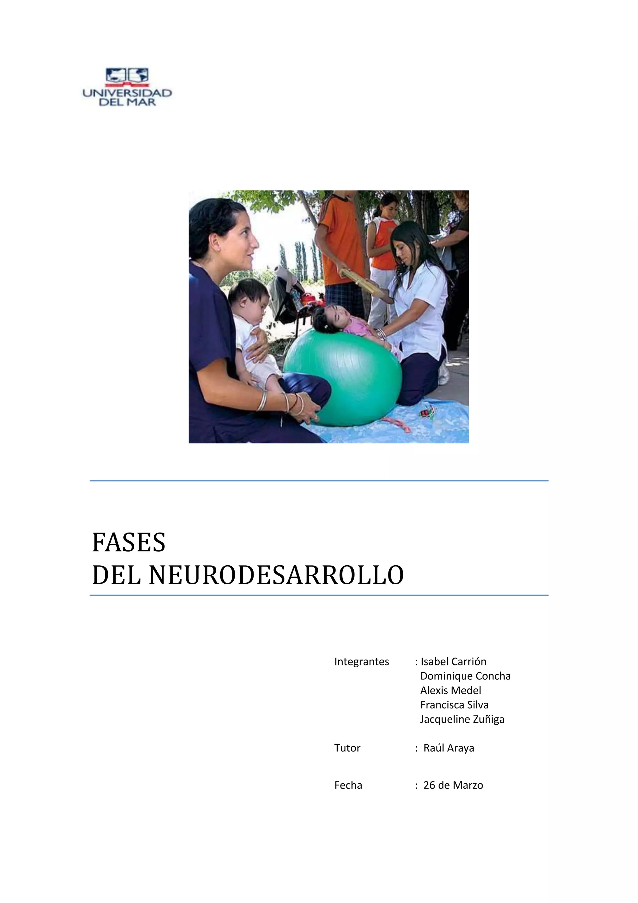 El documento describe las 6 fases del desarrollo del sistema nervioso central: 1) Inducción de la placa neural, 2) Proliferación, 3) Migración y diferenciación, 4) Sinaptogénesis, 5) Mielinización, y 6) Muerte neuronal. Cada fase involucra procesos importantes como la formación del tubo neural, la generación de neuronas y células gliales, el establecimiento de conexiones sinápticas, y la mielinización de axones.
