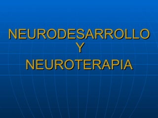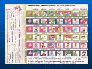 El documento presenta información sobre el neurodesarrollo infantil, incluyendo los procesos de maduración del sistema nervioso central, el desarrollo psicomotor, factores de riesgo para retrasos en el desarrollo, signos de alarma en diferentes edades y ejercicios de estimulación temprana para favorecer el desarrollo normal.