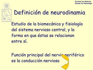 Este documento trata sobre la neurodinamia, que estudia la biomecánica y fisiología del sistema nervioso central y cómo se relacionan. Explica que los test de neurodinamia evalúan aspectos mecánicos y fisiológicos como el flujo sanguíneo y la actividad de canales iónicos. También describe una serie de pruebas clínicas básicas para la evaluación de neurodinamia, como la flexión pasiva del cuello y elevación de pierna extendida.