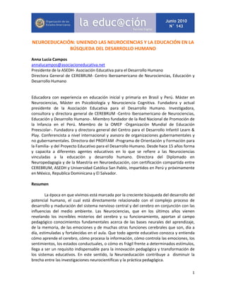 1) El documento habla sobre la relación entre las neurociencias y la educación, y cómo unir ambos campos puede ayudar a mejorar el desarrollo humano. 2) Explica que las neurociencias aportan conocimientos sobre cómo funciona el cerebro y el aprendizaje que pueden usarse para innovar en la práctica pedagógica. 3) Argumenta que para lograr una transformación educativa se debe primero entender los procesos mentales del educador y el estudiante a nivel cerebral.