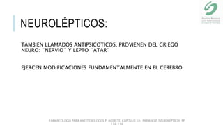Los fármacos neurolépticos, también conocidos como antipsicóticos, son utilizados para tratar trastornos como la esquizofrenia, psicosis y depresión, y se clasifican en típicos y atípicos según su mecanismo de acción y estructura química. Tienen efectos secundarios significativos, incluyendo síntomas extrapiramidales y sedación, y su uso puede complicar la anestesia. Los fármacos más utilizados incluyen clorpromazina, haloperidol, risperidona y quetiapina, cada uno con características específicas de absorción, metabolismo y eficacia.