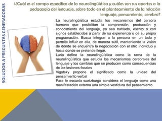 Este documento presenta información sobre los procesos neuropsicológicos del lenguaje y la lectoescritura. Explica que estos procesos son complejos e involucran diversas funciones como la atención, memoria, lenguaje y función ejecutiva. También describe las principales patologías relacionadas como problemas de comprensión lectora, lenguaje oral, escritura, razonamiento, atención e hiperactividad.