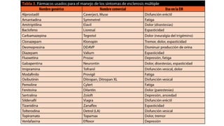 La esclerosis múltiple es una enfermedad desmielinizante y autoinmune que afecta el sistema nervioso central, prevalente especialmente en mujeres jóvenes. Su diagnóstico se basa en la resonancia magnética y criterios específicos, mientras que el tratamiento busca prevenir la discapacidad y manejar los síntomas a través de inmunosupresores y corticoesteroides. Las manifestaciones clínicas varían según las lesiones y pueden incluir alteraciones motoras, sensoriales y cognitivas, con diferentes formas clínicas que determinan el curso de la enfermedad.