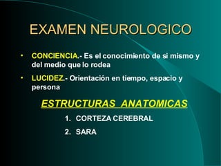 El documento proporciona una guía detallada para realizar un examen neurológico completo. Incluye instrucciones para evaluar la conciencia, facies, actitud, marcha, función motora, sensibilidad, reflejos y signos meníngeos. El examen cubre pruebas como la exploración del estado de conciencia, examen de la marcha, pruebas de los reflejos patológicos y la evaluación de la sensibilidad somática y profunda.