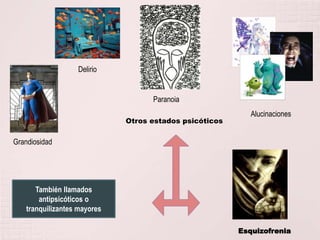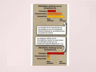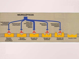 Este documento describe los neurolépticos o antipsicóticos, que se usan para tratar síntomas psicóticos como delirios y alucinaciones. Actúan antagonizando los receptores de dopamina en el cerebro. Aunque no curan la esquizofrenia, permiten que los pacientes funcionen mejor. Los nuevos antipsicóticos atípicos también bloquean receptores de serotonina. Sus efectos incluyen la reducción de síntomas positivos y negativos de la psicosis, así como efectos secundarios como distonías