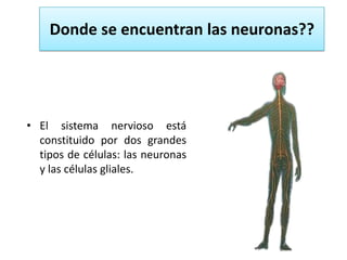 Las neuronas son las células fundamentales del sistema nervioso que transmiten impulsos nerviosos. Se componen de un soma, dendritas y un axón. Existen diferentes tipos de neuronas como unipolares, bipolares y multipolares. Las neuronas pueden ser sensoriales, motoras o interneuronas. Se comunican entre sí a través de sinapsis químicas para transmitir información de forma eficiente en el cuerpo.
