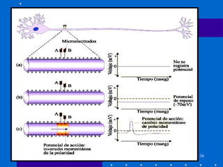 El documento describe las características y funciones de las neuronas y el sistema nervioso. Las neuronas son células especializadas en recibir, conducir y transmitir impulsos nerviosos, permitiendo al sistema nervioso detectar estímulos y coordinar las respuestas del organismo. El documento también describe la estructura y tipos de neuronas, así como el proceso de generación e transmisión del impulso nervioso a través de potenciales de membrana y canales iónicos.
