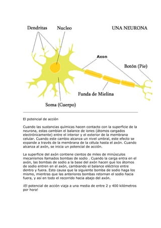 Este documento describe la estructura y función de las neuronas. Explica que las neuronas están compuestas de un soma que contiene el núcleo, dendritas que reciben señales químicas, y un axón que transmite señales electroquímicas a otras neuronas a través de sinapsis. También describe cómo los potenciales de acción viajan a lo largo del axón y cómo los neurotransmisores transmiten señales entre neuronas a través de las sinapsis. Finalmente, clasifica a las neuronas en sensoriales, motoras e interneuron